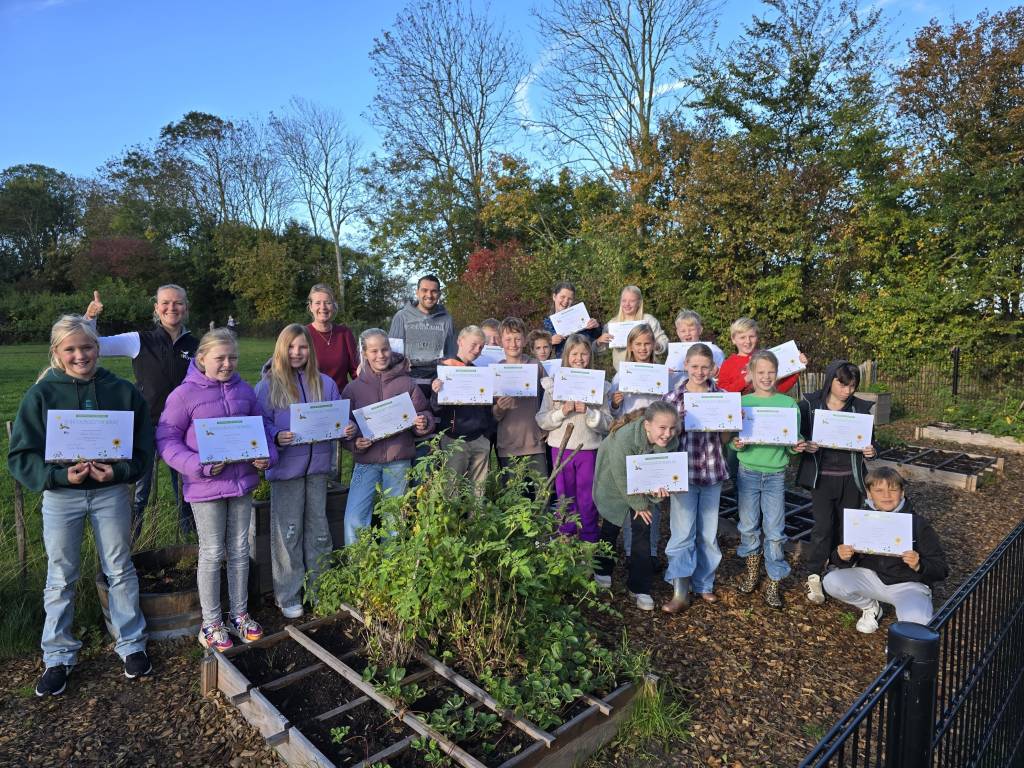 De certificaten werden uitgereikt door Joanneke Romkema, Schoolmoestuinadviseur van NME De Klyster. “We zien hoe trots de kinderen zijn als ze letterlijk de vruchten plukken van hun eigen werk,” vertelt Romkema. “Ze hebben niet alleen geleerd hoe groenten groeien, maar ook hoe alles in de natuur een nut heeft en met elkaar verbonden is.”