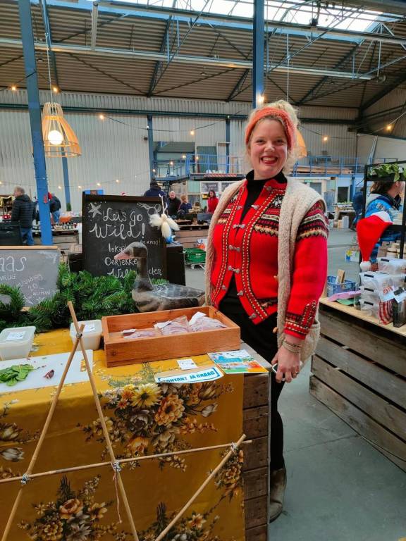Tijdens de markt kun je genieten van een heerlijk assortiment: gerookte ganzenborst, kant-en-klare ganzenstoof (alleen even opwarmen!), haar beroemde erwtensoep met gans, droge worst van gans en wildburgers van gans.